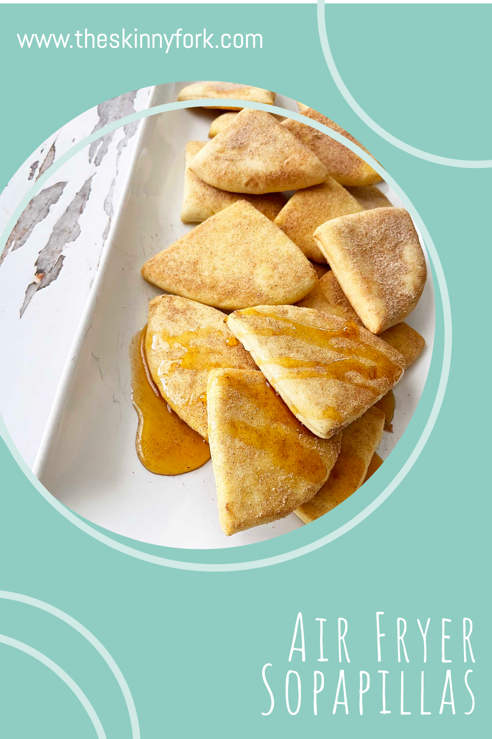 Yield: 4Author: The Skinny Fork (Amanda Plott)Prep time: 5 MinCook time: 6 MinInactive time: 20 MinTotal time: 31 MinEasy to make little air fried sopapillas that takes just a few ingredients and hardly any time at all to cook! Dust with some cinnamon sugar and/or honey for a delicious dessert.Ingredients